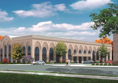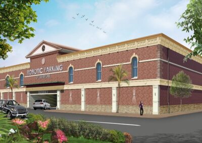 Robotic Parking Systems can help to solve this, first with the reduced footprint (requiring approximately half the space of traditional garages), and secondly, with a facade that can be completely customized to fit the architectural detail of the area.